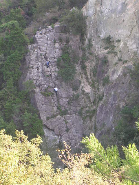 白いシャツの人と、少し下に青いシャツの人がいるのですが、この人達は二人ペアでロープなどを使って登っていたんだろと思います。