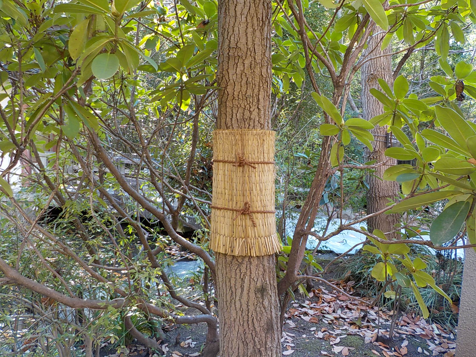 帰りがけに通った植物園の中で、樹木の幹にコモが巻かれていました。ここも冬支度なんですねえ。