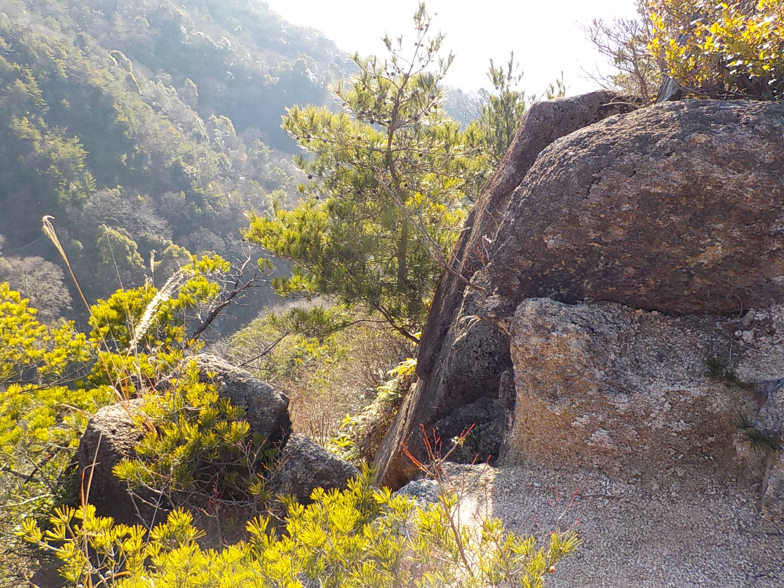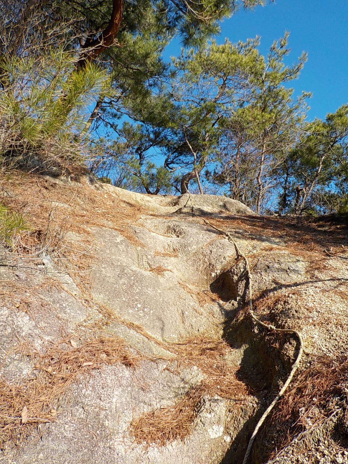 でも道がついているわけではないので生えている木や、岩はだを掴んで4,5メートル登ります。、さて向こう側はというと切り立っているので降りれない><。イノシシのいるところは過ぎているけど道側もかなり急なので降りるのは無理。