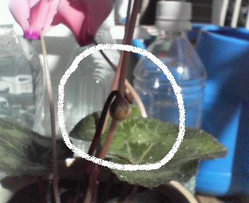 そうだったんだ~(^^)、と思って今朝は久しぶりにベランダに出してみました。ケータイの画像でわかりにくいのですが、白い輪の真ん中あたりがシクラメンの実です。