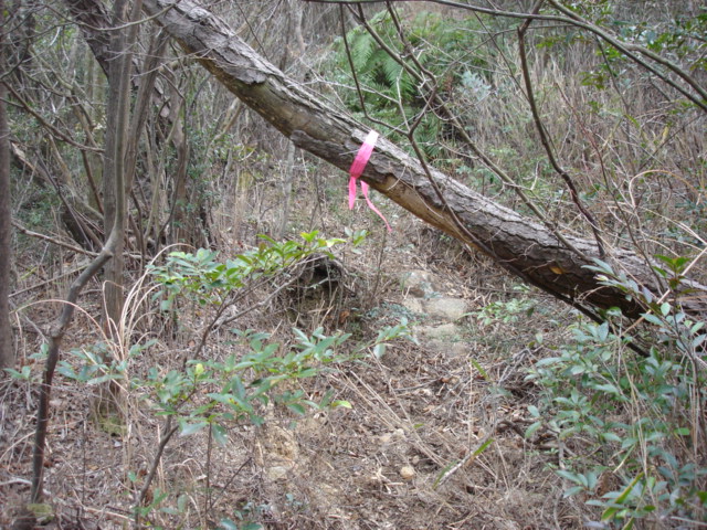 ここで助かったのが、樹の枝などに巻かれた赤いテープ。かなり色あせていて、少なくとも一年やそこら前のモノだろうと思いますが・・。あちこちに道標として付けられていたのを辿ってかなり降りることが出来ましたが、随分と時間がかかってしまった。^^;