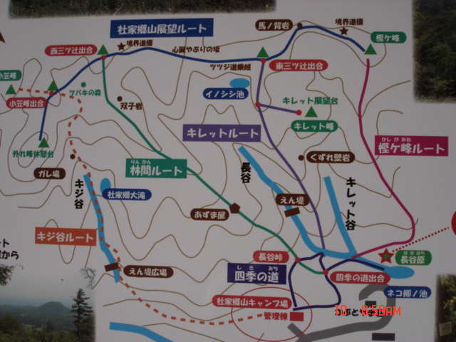 この中で一番東にある樫ヶ峰ルートで上がって稜線(展望ルート)を東へ歩いて、東の橋にある小笠峰を見て、外れ峰のあたりから西にあるキジ谷というルートを下ってキャンプ場へ。