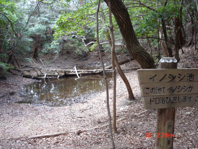 ここから展望ルートまで上がる途中にイノシシの池というのがあって、そこでイノシシがドロ浴びをするのだと看板がでていました(笑)。