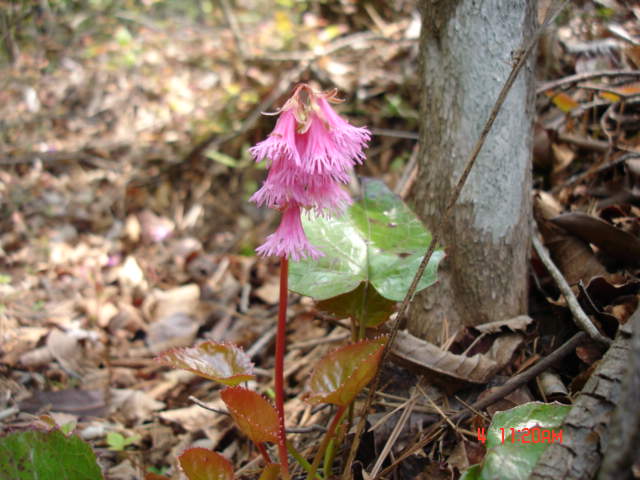 これはオオイワカガミという咲く山の花です。六甲山のこの時期の花です。別の場所では群生しているのも見つけました。これは花の色が濃いピンクのもの。