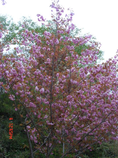 このあととかが尾山というところを経由して、自動車道にでて少し歩いて熊笹峠ということろからまた山道に戻ったのですが、その自動車道沿いに八重桜が2本植わっていて満開でした。