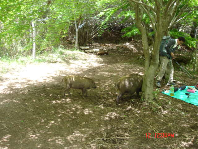 背負っていたデイパックを下ろして、おにぎりを取り出して食べ・・2つ目を食べ終わるかなと言う頃に突然イノシシがやって来ました。腰をおろして食事をしている人たちもかなり慌てている。