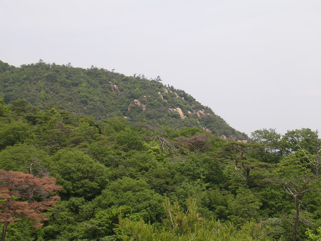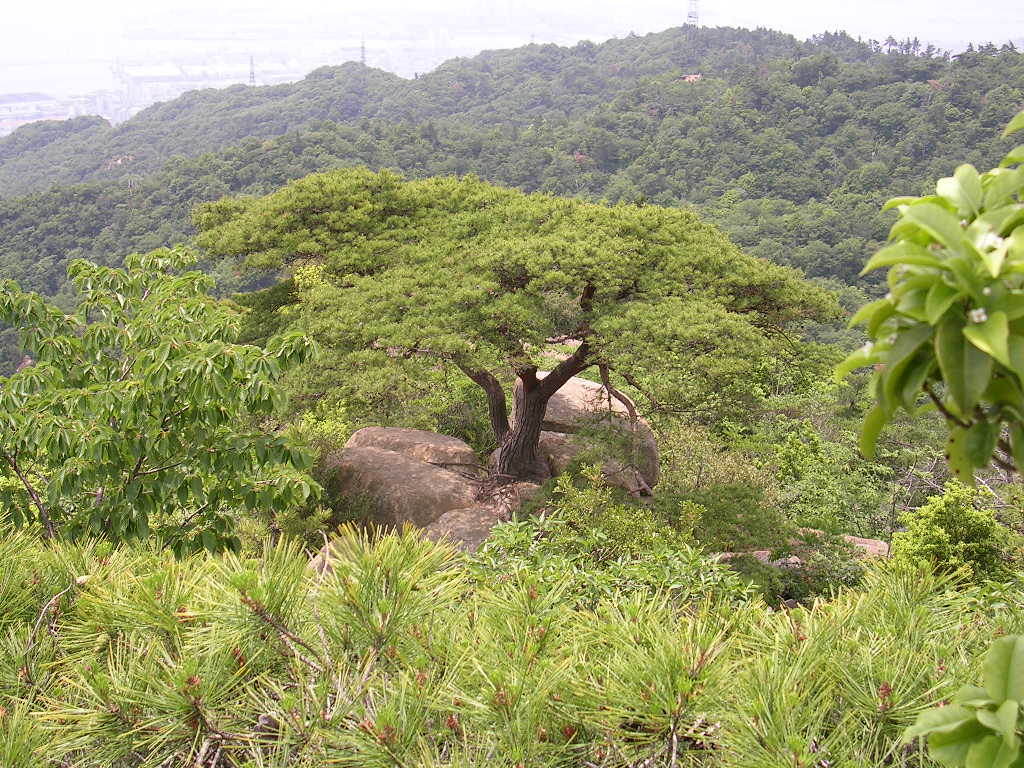 たしかに大きな岩がたくさん写ってるんだけど、よく見ると岩があちこちある山の際、斜面が少しゆるやかになるあたりに傘を開いたような木がみえる。