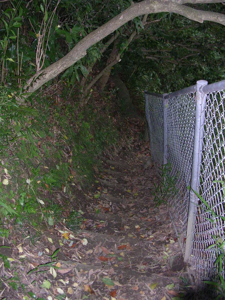 この階段を登ってすぐのところに左手に向かう別れ道。そこには腹切りやぐらという場所がありました。小学生が何人もやってきて、ワイワイと言いながら写真をとったりぬかるんだ道を腹切りやぐらの方へ歩いて行きました。