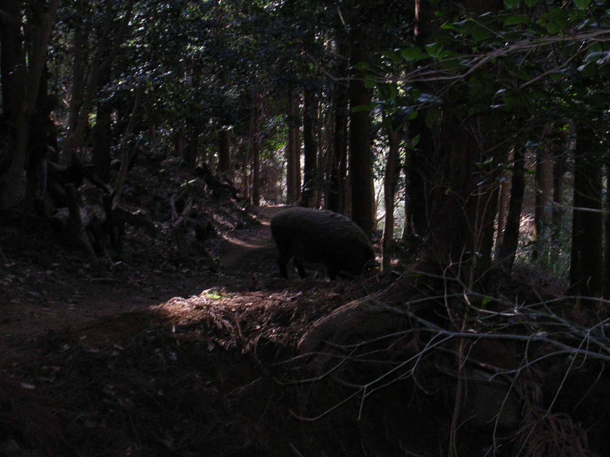 一度目は一匹だけ、歩いて行く向こうの方に走って逃げていったので良かったのですが、二度目は道の真ん中にいた親子の二匹。仔のほうはこちらに気がついて母親のそばに逃げてくれたのだけど、その母親イノシシの方は、こちらの頓着無く食べ物を探していました。なので少し道を外れた斜面に登って、イノシシの様子を伺いながらソロリソロリと進みました^^;。