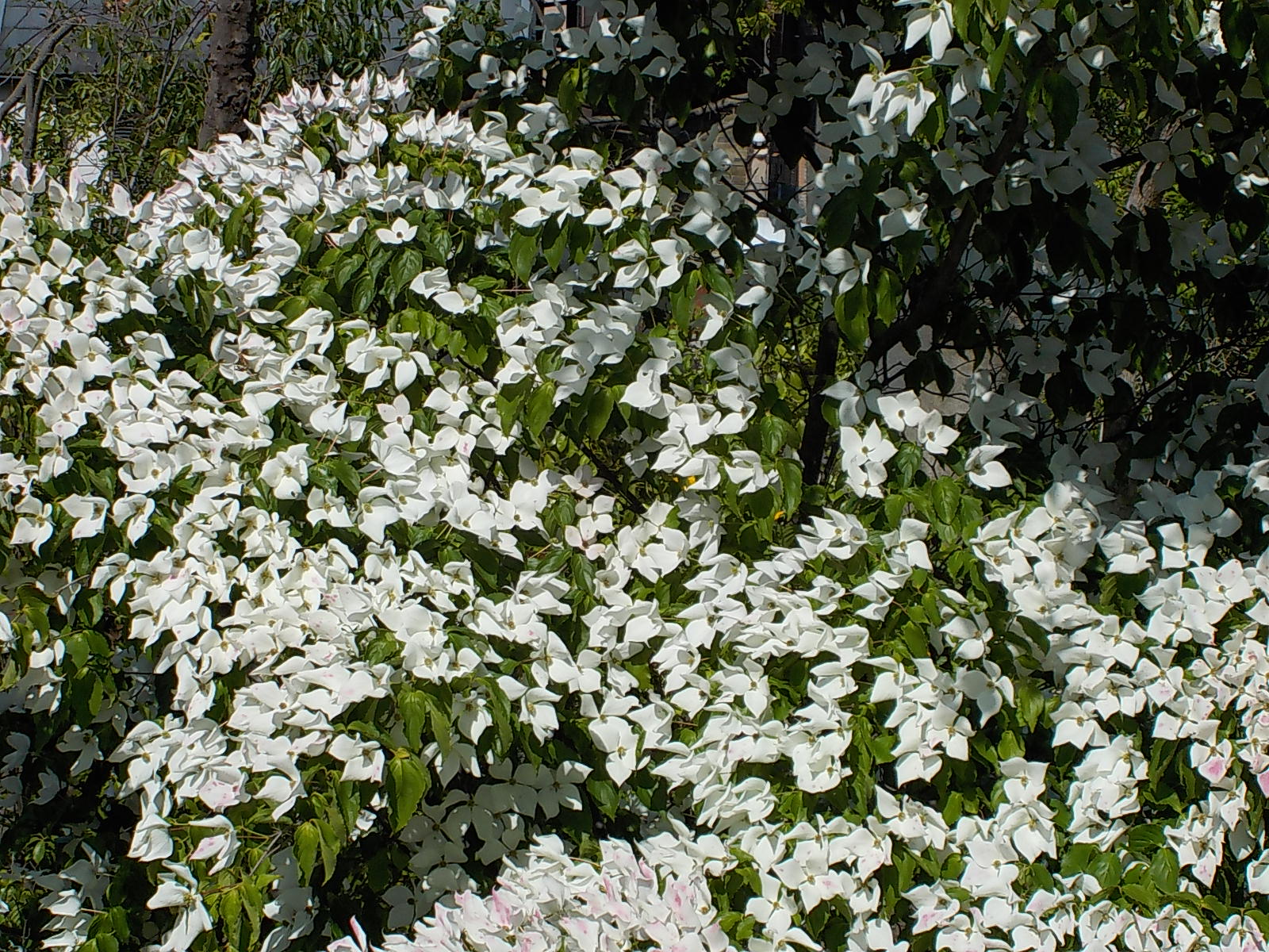 同じ場所からみおろすとヤマボウシの木に満開の花が着いていました。