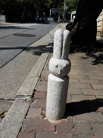 鳥居の直前にある歩道にはなにやらウサギっぽいガードというのかな?が等間隔で置かれているところです。前にも画像を載せたかと思いますが、キャラクターのウサギに似せようとしたけど、やっぱり止めたという感じが満載の作品?です(笑)。