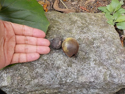例によって側溝に落ちていたもので、左側のものはすでに種だけになっていました。右のものがクルミの実です。種と比べるとそれなりに実がついているのが分かると思います。