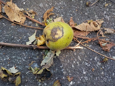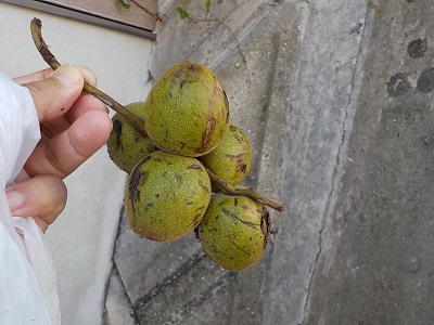 でもそこから少しのところに落ちていた枝に着いたままのクルミの実を見てびっくりしました。りんごとは似ても似つかないです^^;。