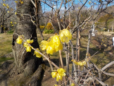 庭木では梅もまだ固い蕾で、ソシンロウバイがテカテカと輝いてました。
