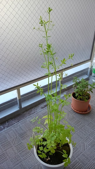 ベランダで頑張っるスープセロリが小さな花をつけました。