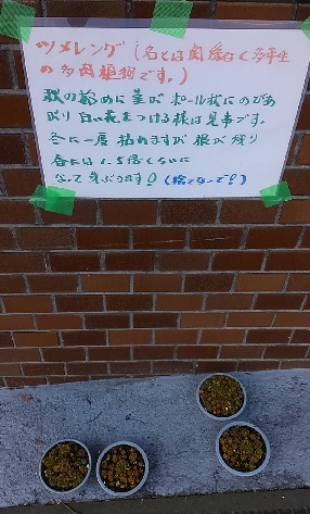 昨日は、海タマネギというのと多肉植物のツメレンゲというのがおいてありました。海タマネギというのは鉢植えにタマネギのような形のものがあって、そこから葉が2枚出ていましたが花が咲くまでに数年かかるということでした。聞いたこともない植物なので遠慮して、多肉植物のツメレンゲを一鉢頂いて帰りました。