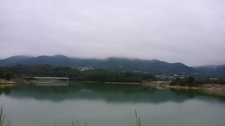 ダムにたどり着くと、西に見える小さな山並みは低い雲で覆われていて、まるで梅雨のようでした。