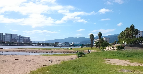 ここは市内では数少ない浜辺が残っているところです。少し離れたところには人工の島があるので、ほとんど波もなく海に来たというよりもおおきな河口のように思えます。