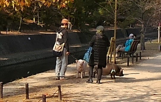 よく行く川沿いを歩いていたら前方にかなり太った焦げ茶色の犬を連れた人が立ち話をしていたんですよね。とんでもなく太った犬だなあ、お腹も大きいのかなと思ってどんどん近づいていくと、なんとそれは豚でした。しかも色違いもいます。