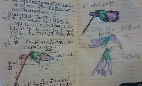 今までは100均の薄いメモ帳にスミレのことなど書いてました。これは12月初めからのページで絵は一昨日のスミレの観察のときものです。(走り書きというのもあるけど字がむちゃくちゃ汚い^^;)
