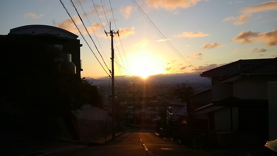 でもここはと思って行ってみても日の出る方向に家があったり、うまく見られる場所がなかなか見つかりません。そうしてるうちに雲が明るくなってきてしかたなく坂の途中で立ち止まって見ることにしました。