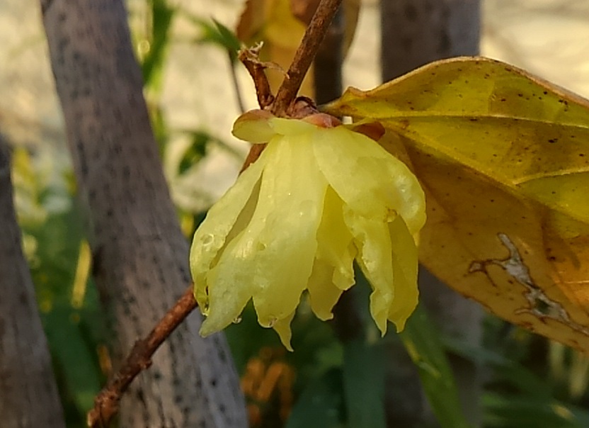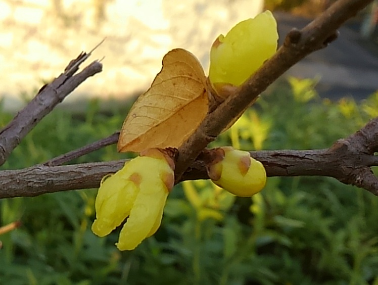 通るたびにいつ咲くのかなと気にしていたロウバイ。ようやくいくつか花を開いてました。