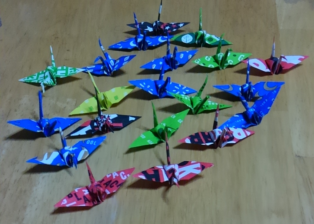 さて、ガムの包装紙の折り鶴が20羽を超えました。このまま増えても仕方がないので処分しようと思いましたが、その前に画像に残しておきます。