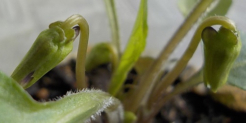 ペットボトルで育ってる株の成長が目に見えてわかるので、今はこちらを主に見ています。今の所蕾が4つ。そのう2つはガクの間から花弁が見え始めていますので、もう数日すれば小さな花が咲くのではないかと思います。ガクの後ろに飛び出た距(きょ)の後ろ側には薄く紫の色が着き始めました。