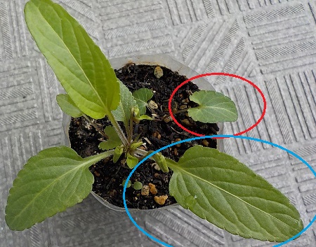 左下の三枚の葉(青円)の形とペットボトルの上側の小さな株の一枚の葉(赤円)の形。三枚のものは鳥の羽のような形ですが、小さいのは細長いハート型をしています。葉の形がここまで違うと明らかに別の種類だと判断できます。