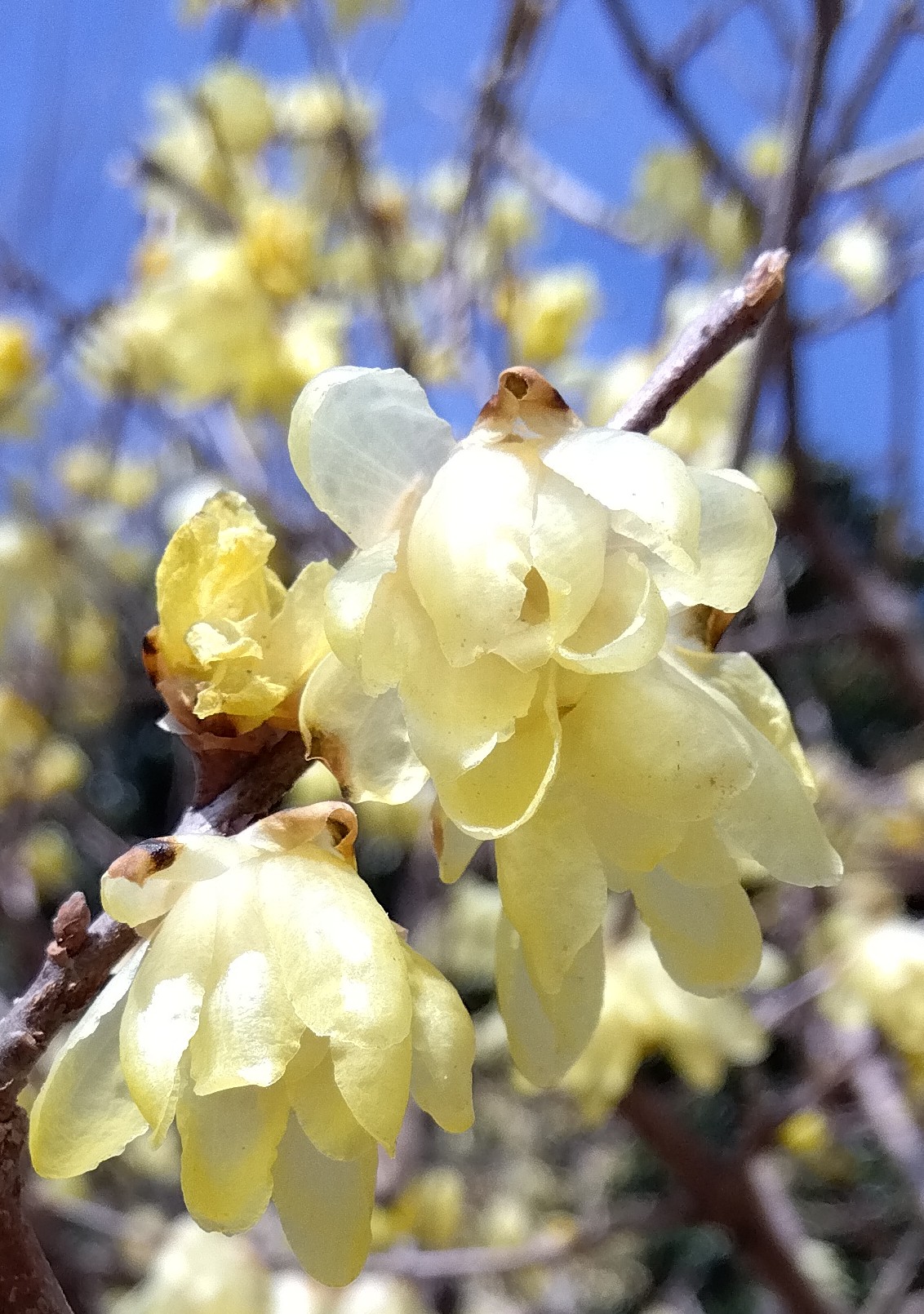 同じ場所に3本蝋梅の木があって、どの木もびっしりと花を着けていました。