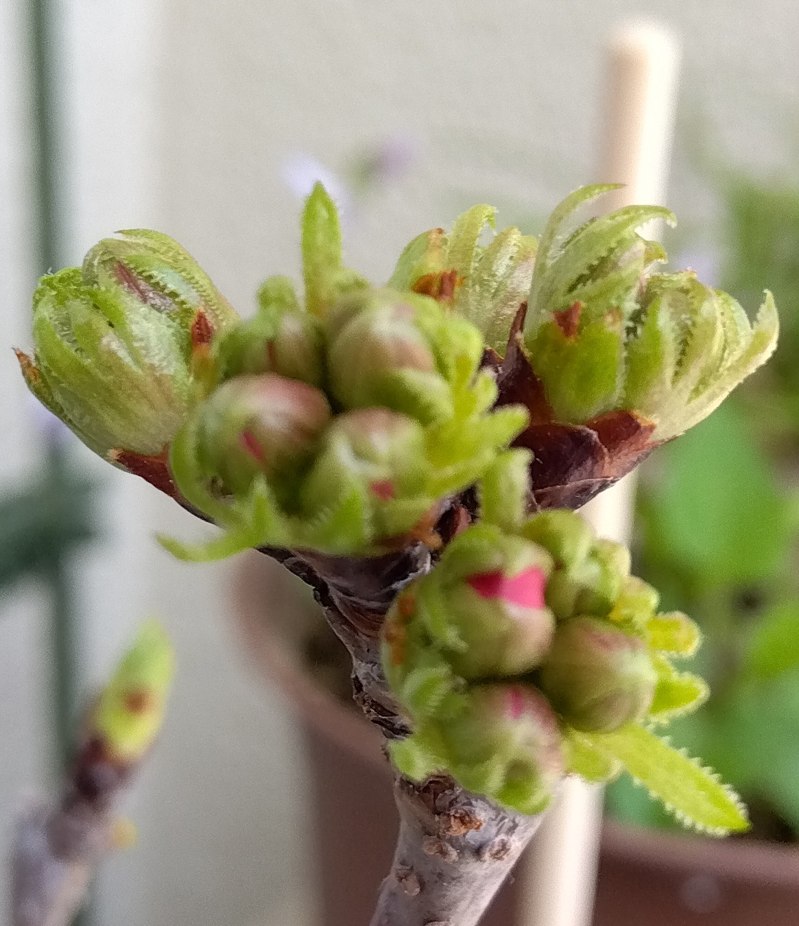 ベランダの一才桜のつぼみが顔を出し始めました。