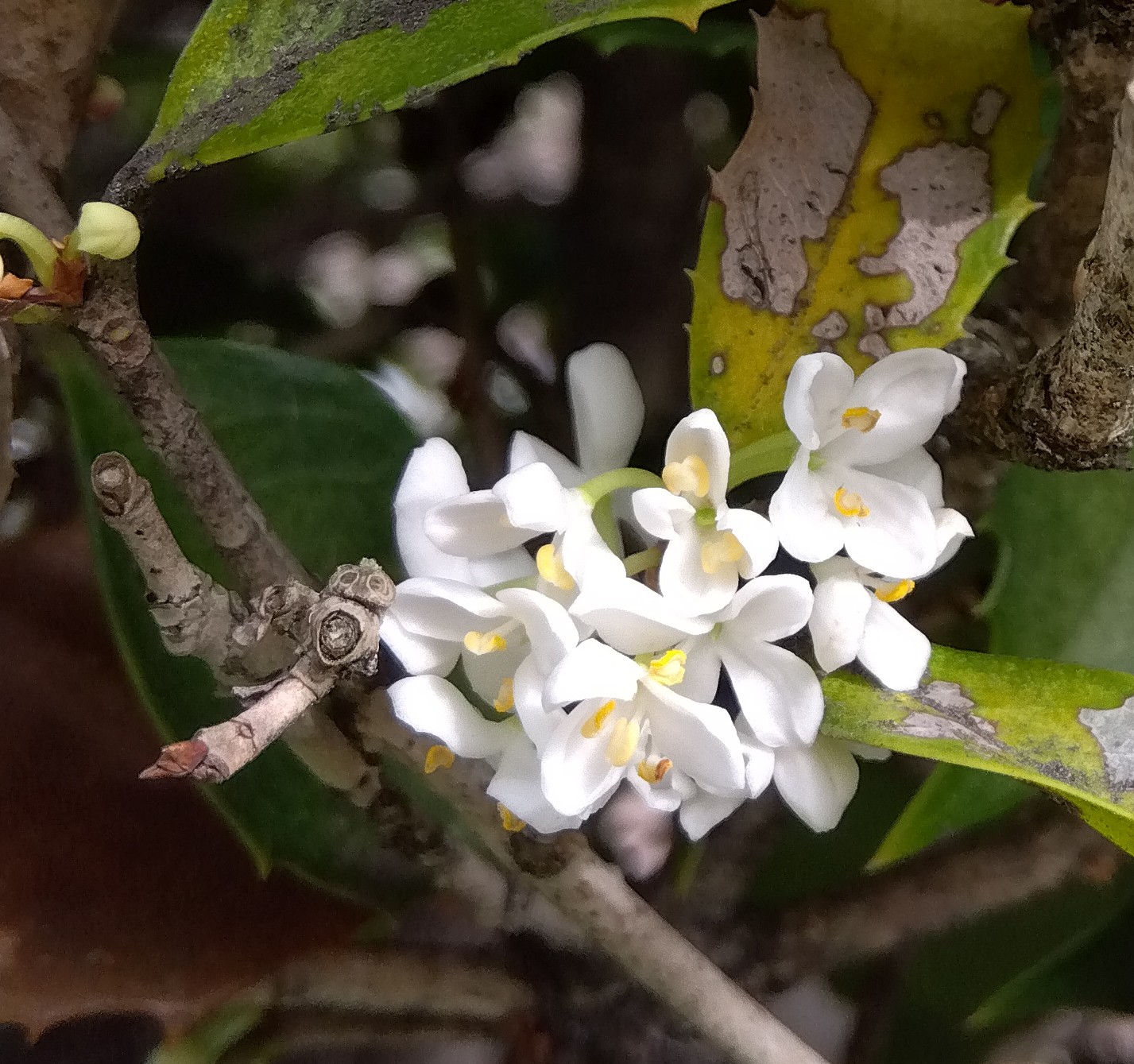 ギンモクセイの花です。花の形はキンモクセイと同じようなのですが、色が全く違うのと付いている花の数が全然違いますね。
